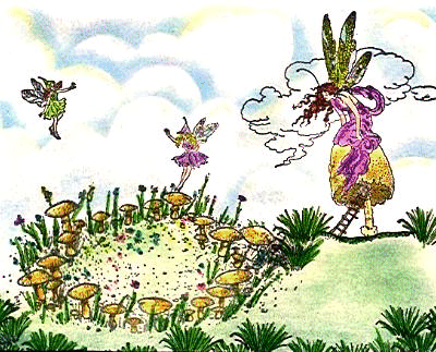 Fairies often dance in circles in the grass, surrounded by mushrooms called Fairy Rings and this spells danger for the human passerby. The wild enchantment of the fairy music can lead him relentlessly towards the ring which, like a fairy kiss or fairy food and drink, can lead to captivity for ever in the world of Fairies. If a human steps into the ring he is compelled to join the fairies in their wild prancing. The dance might seem to last only minutes, or hours, or even at most a whole night but in fact the normal duration would be seven years or by our time and sometimes longer. The unfortunate captive can be rescued by a friend who, with others holding his coat-tails, follows the fairy music, reaches into the ring (keeping one foot firmly outside the ring) and pulls the dancer out.